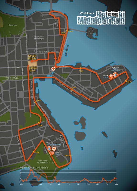 The 10 km route weaved and undulated mostly along the seaside of Helsinki, through some dimly lit streets and parks. Throughout there was sufficient light to make running a safe experience. The surface was mostly asphalt apart from a few cobble-stoned streets.