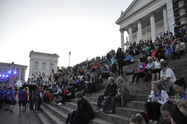 The start and finish area is situated in the city centre at the beautiful Senate Square. As the evening gets darker, the night lights of the Helsinki Cathedral right by the square make the atmosphere rather magical. The steps in front of the cathedral can host a large audience and with the square the area can easily host even a bigger event. With the 11,000 thousand runners there was plenty of space for everyone to get ready for the challenge to come.