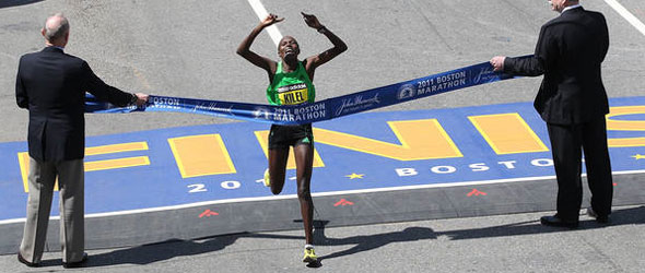 BOSTON – (April 18, 2011) – The 115th running of the Boston Marathon on Monday turned out to be one of the record books – it just depends on which ones you want to rewrite.Kenya’s Geoffrey Mutai, 29, ran the fastest marathon in history – 2 hours, 3 minutes, 2 seconds – a time 57-seconds faster than the world record set by Haile Gebrselassie at Berlin in 2008 and an almost incomprehensible three minutes better than Robert Kiprono Cheryuoit’s course record of 2:05:52, which was deemed virtually untouchable when he set it last year. Mutai’s mark will not count as a world record, however, because the Boston course exceeds the IAAF limits on drop and separation from start to finish. Similarly, Ryan Hall’s fourth place U.S. course record 2:04:58 won’t erase Khalid Khannouchi’s 2:05:38 from London 2002 as the U.S. record. In short, the Boston course is not record standard.
