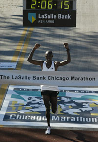 CHICAGO, Ill. – (October 10, 2004) – Evans Rutto extended his perfect record in the marathon with a comfortable 2:06:16 victory at the LaSalle Bank Chicago Marathon. The 26-year-old Kenyan obliterated a lead pack of six runners with a 4:39 20th mile and held his form in the windy final miles, to go three-for-three at the very top of global marathoning.