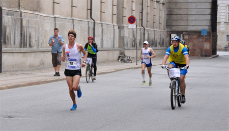 In the Men’s race, the designated pacer, Kevin Quinn, triggered his knee when navigating a bollard and had to retire from his duties. So after just 20 minutes of running the host club Sparta’s Steen Walter took off like a scorched rabbit after the Irish athlete, Alan O’Shea, had experienced problems at the water-point.