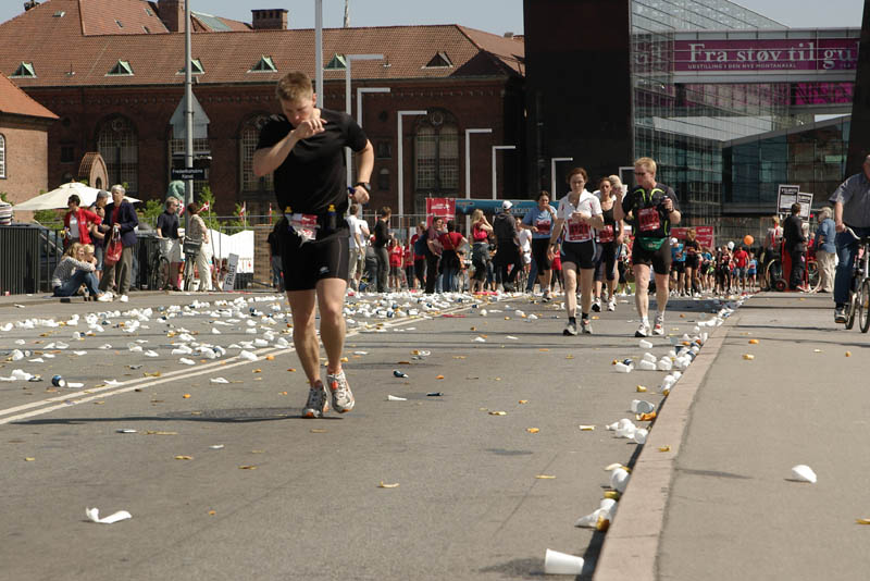 A waterpoint 'battle zone' with runners still facing 25 more kilometers - Copenhagen Marathon 2007
