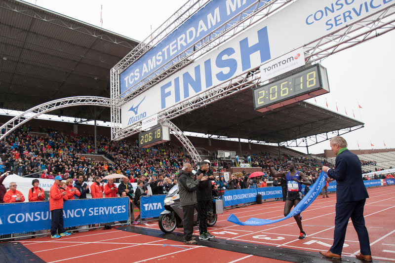 Sunday 18th October 2015 – Bernard Kipyego won the TCS Amsterdam Marathon for the second year in a row, clocking a time of 2.06.19. Minutes later, elation was quickly followed by disappointment in the Olympic Stadium. Abdi Nageeye’s race over the classic distance of 42.195 km in 2.10.24 earned him a ticket to Rio de Janeiro. Michel Butter and Khalid Choukoud just missed the Olympic qualifying time of 2.11, posting 2.11.08 and 2.11.34 respectively. Joyce Chepkirui won the women’s race in 2.24.11.