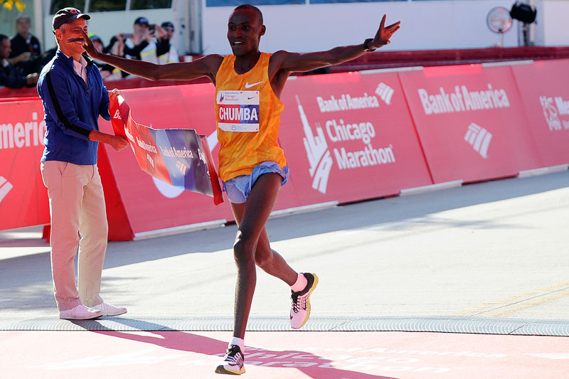 CHICAGO MARATHON 2016 – Dickson Chumba and Florence Kiplagat Claim Victory in Chicago Marathon 2016. In today’s Bank of America Chicago Marathon, more than 37,000 runners crossed the finish line in Grant Park on a sun kissed day with strong winds out of the southwest. For the first time in more than two decades, pacesetters were not at the helm of the race, and in a strategic competition up front, the men’s race saw a Kenyan sweep with Dickson Chumba running away from the field in 2:09:25, Sammy Kitwara finishing as the runner-up for the second time in 2:09:50, and newcomer to the Abbott World Marathon Majors (AWMM), Sammy Ndungu, sprinting down the homestretch for third in 2:10:06.