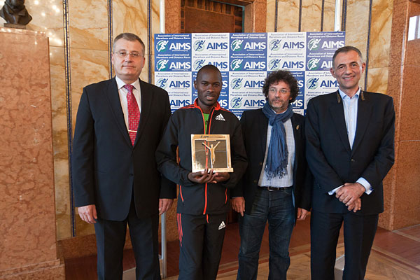 Makau received the Award from the Prague deputy, Jiří Nouza, a member of the AIMS Board of Directors, Bruno Boukobza from France and Carlo Capalbo, President of the organizing committee of Saturday’s Mattoni Prague Grand Prix, where Makau will run the Metro 10K Race.