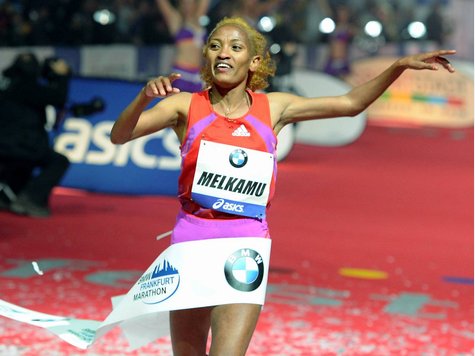 But when Deressa Chimsa of Ethiopia shot away from the final quintet at 34k, leaving Makau 50 metres in arrears, another victory in Germany for the Kenyan looked a distant dream. But Makau isn’t world record holder for nothing. He gradually reeled in the Ethiopian, took the lead at 39k, and opened up a winning margin close to three-quarters of a minute, coming home to the traditional, if unusual finish, on the red carpet, greeted by fireworks, cheerleaders and ear-splitting music inside Frankfurt’s old Festhalle (Festival Hall).
