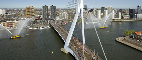 A few minutes before the traditional canon fire that starts the Rotterdam Marathon, conditions are reasonably well. Sunny weather,little wind, no chance of rain, 60% humidity. The only thing that mightbe a threat to fast times is the temperature. Were organisers were hoping for 12-14 degrees, the sun pushed that up to 15-17 degrees.