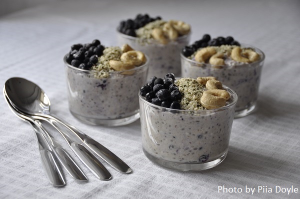 Jos käytät vaahterasiirappia makeutukseen voit vain mitata kaikki ainekset, sekoittaa ja jättää puuron tekeytymään kannelliseen astiaan. Jos teet puuron illalla, laita se jääkaappiin. Aamulla puuro saa jäädä tekeytymään huoneenlämpöön, jolloin mustikatkin sulavat nopeammin.