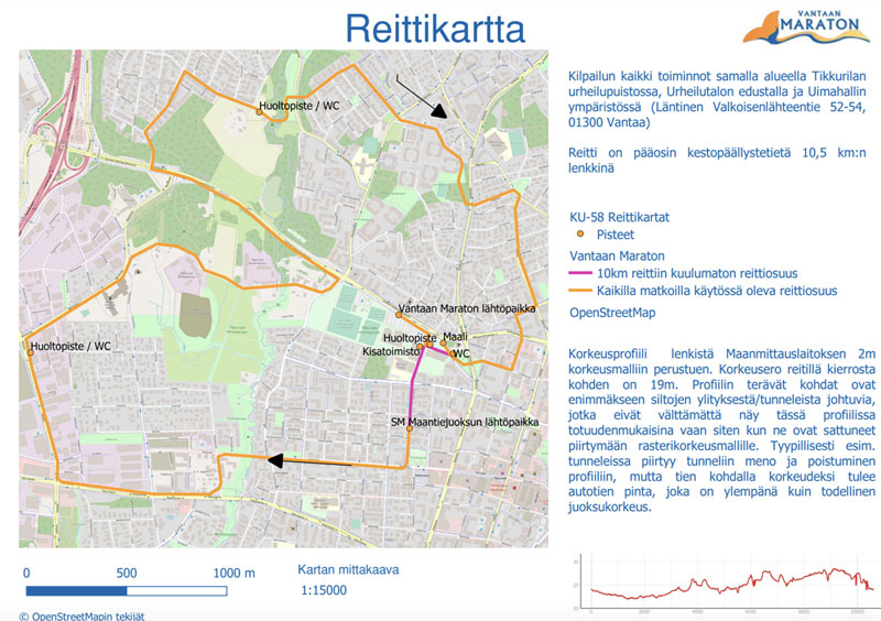 Vantaalla reitti on tunnetusti nopea ja tasainenkin. Reitti on pääosin kestopäällystetietä, ja tapahuma juostaan 10,5 km:n lenkkeinä. Kilometrit on merkitty kyltein täysmaratonin mukaan. Kyltit ovat hieman alimittaisia kympille, sillä maantiekympin startti on hieman eri paikassa, kuin muiden matkojen. Huoltopisteitä on reitillä kolme (3,5 km Niittytie, 7,0 km Angervotie ja 10,5 km kisakeskus).